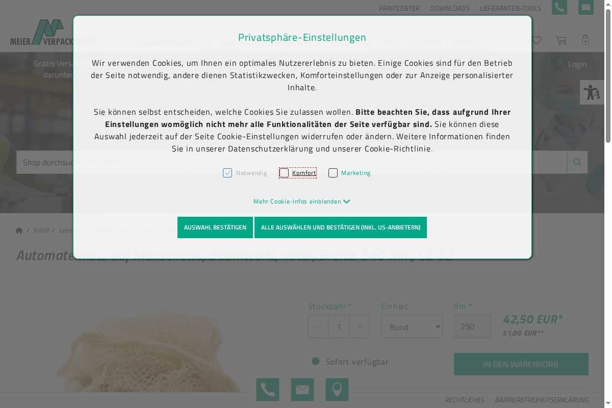Wir sind Ihr Verpackungspartner - Jetzt kaufen: Automatennetz auf Manschette, Baumwolle, natur, Breite: 540 mm, CE 62
