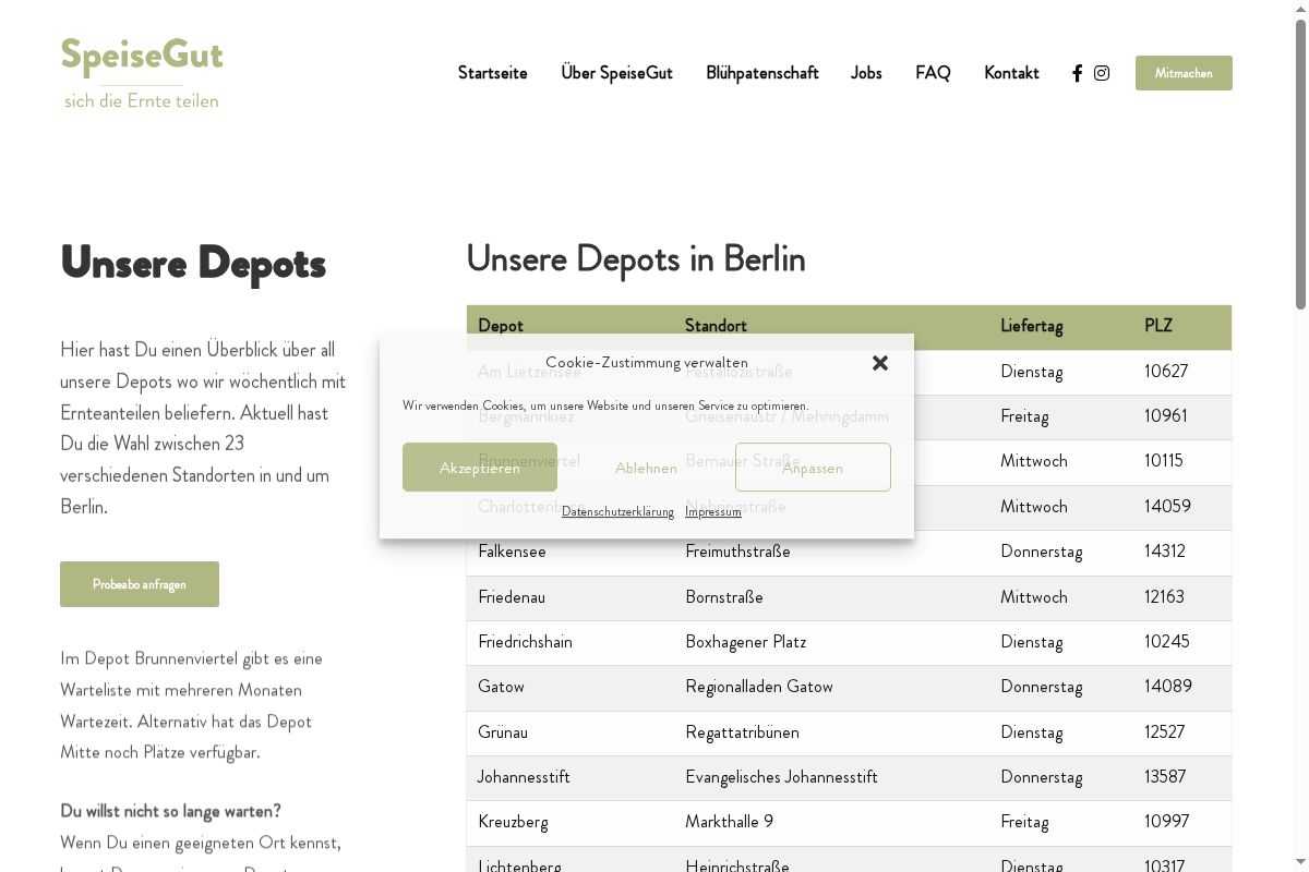 Startseite Über SpeiseGut Blühpatenschaft Jobs FAQ Kontakt Mitmachen Menu Close Unsere Depots Hier hast Du einen Überblick über all unsere Depots wo wir wöchentlich mit Ernteanteilen beliefern. Aktuell hast Du die Wahl zwischen 23 verschiedenen Stan