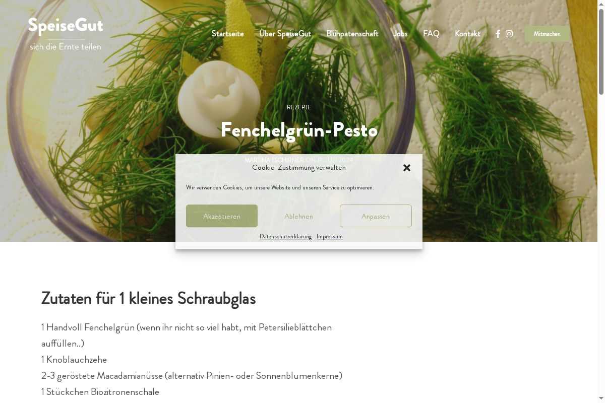 Startseite Über SpeiseGut Blühpatenschaft Jobs FAQ Kontakt Mitmachen Menu Close Rezepte Fenchelgrün-Pesto Martina Tschirner on 17. Juli 2024 Zutaten für 1 kleines Schraubglas 1 Handvoll Fenchelgrün (wenn ihr nicht so viel habt, mit Petersilieblättch